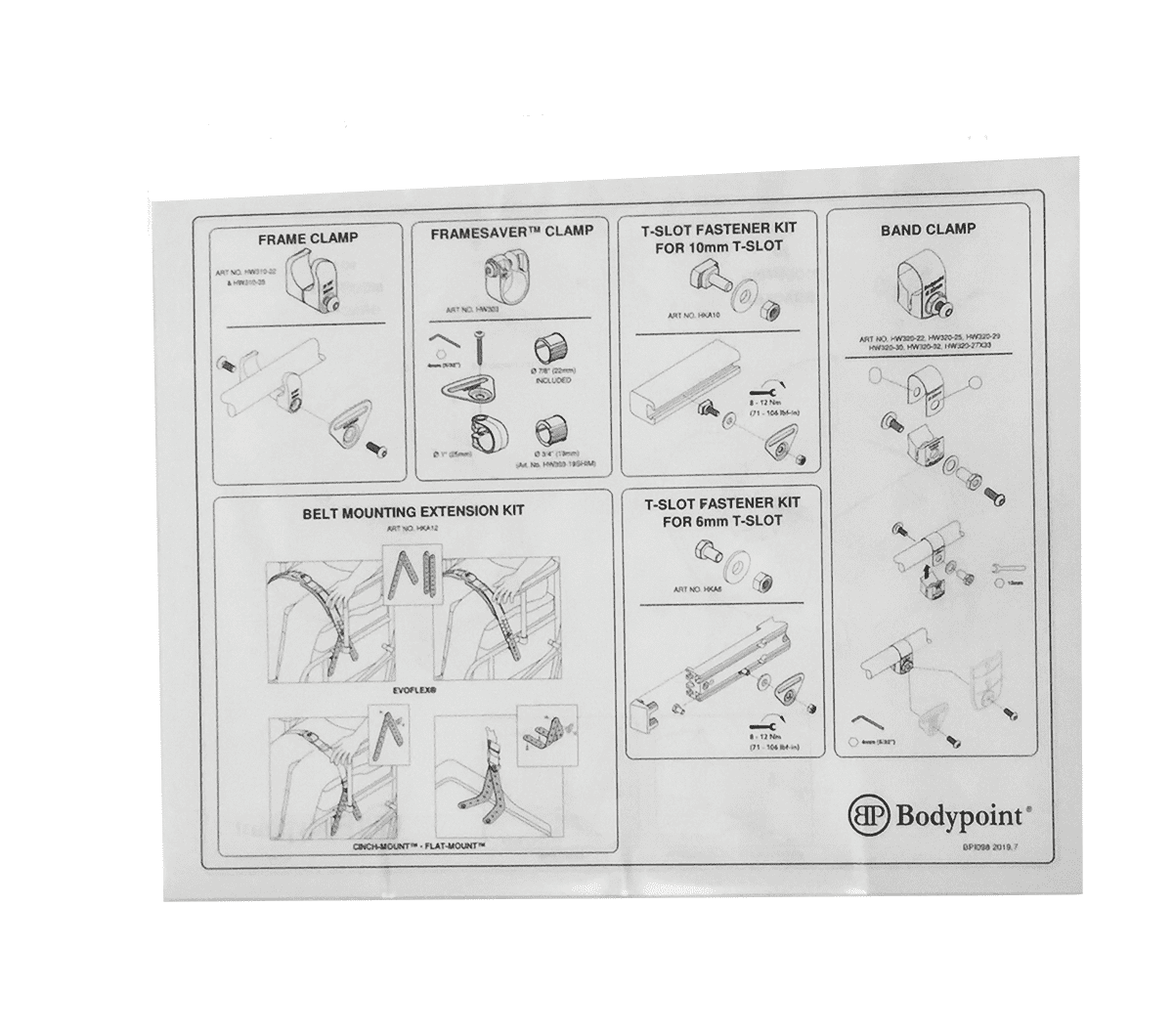 The Mounting Hardware Kit (191207) comes complete with the following Bodypoint mounting hardware, plus other handy tools:
